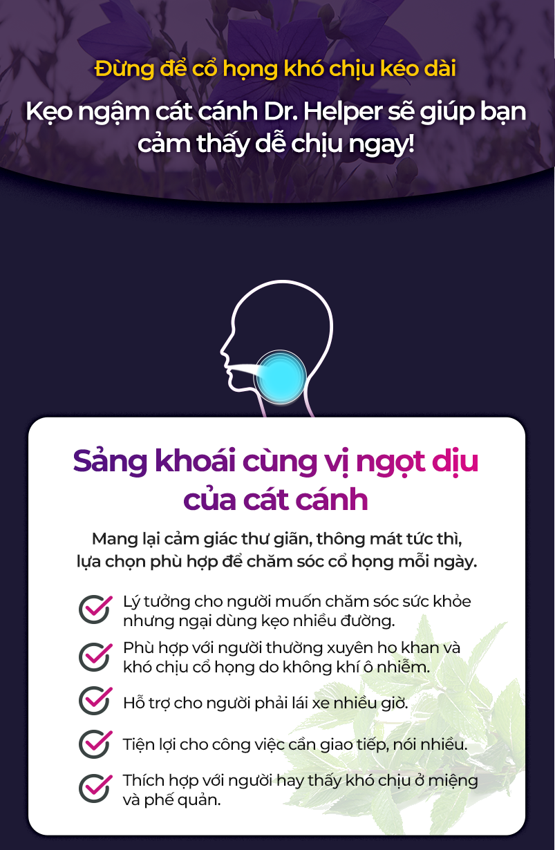 Kẹo ngậm keo ong và cát cánh Dr. Helper là giải pháp chăm sóc cổ họng tiện lợi hằng ngày. Sản phẩm kết hợp từ nhiều thành phần tự nhiên, giúp làm dịu cổ họng, mang lại cảm giác dễ chịu khi sử dụng. Đặc biệt phù hợp cho người thường xuyên nói nhiều, làm việc trong môi trường máy lạnh hoặc khi thời tiết thay đổi.