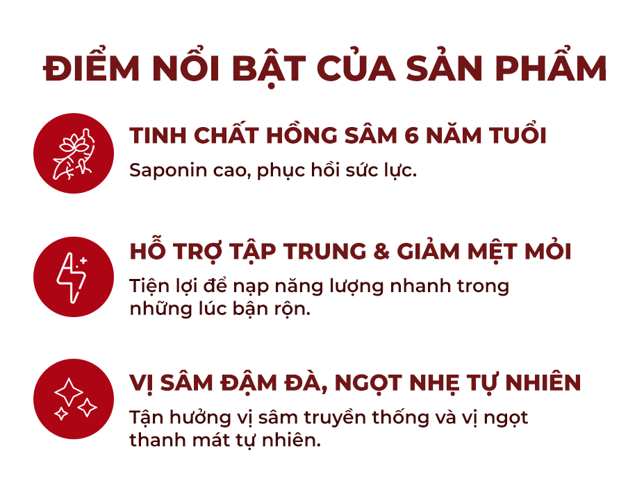Mang đến hương vị hồng sâm đậm đà và tinh khiết. Thành phần hồng sâm cô đặc giúp bạn tỉnh táo và sảng khoái tinh thần.