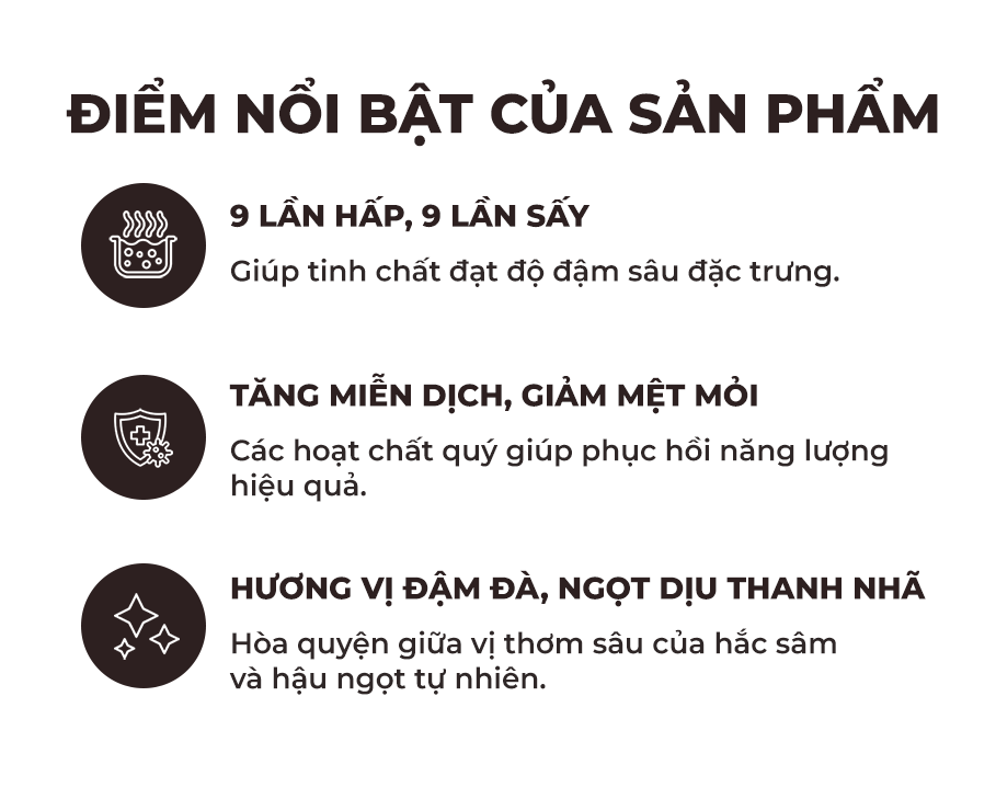 Hương vị hồng sâm đậm và thảo mộc, được chế biến theo phương pháp hấp sấy truyền thống 9 lần.