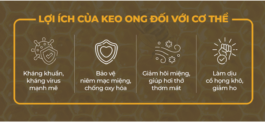 Sự kết hợp hoàn hảo giữa vị ngọt của mật ong và công dụng của keo ong. Giúp mang đến cảm giác dịu nhẹ cho cổ họng. Phù hợp để bạn chăm sóc họng hàng ngày.