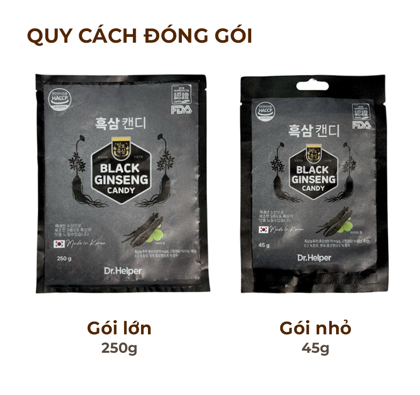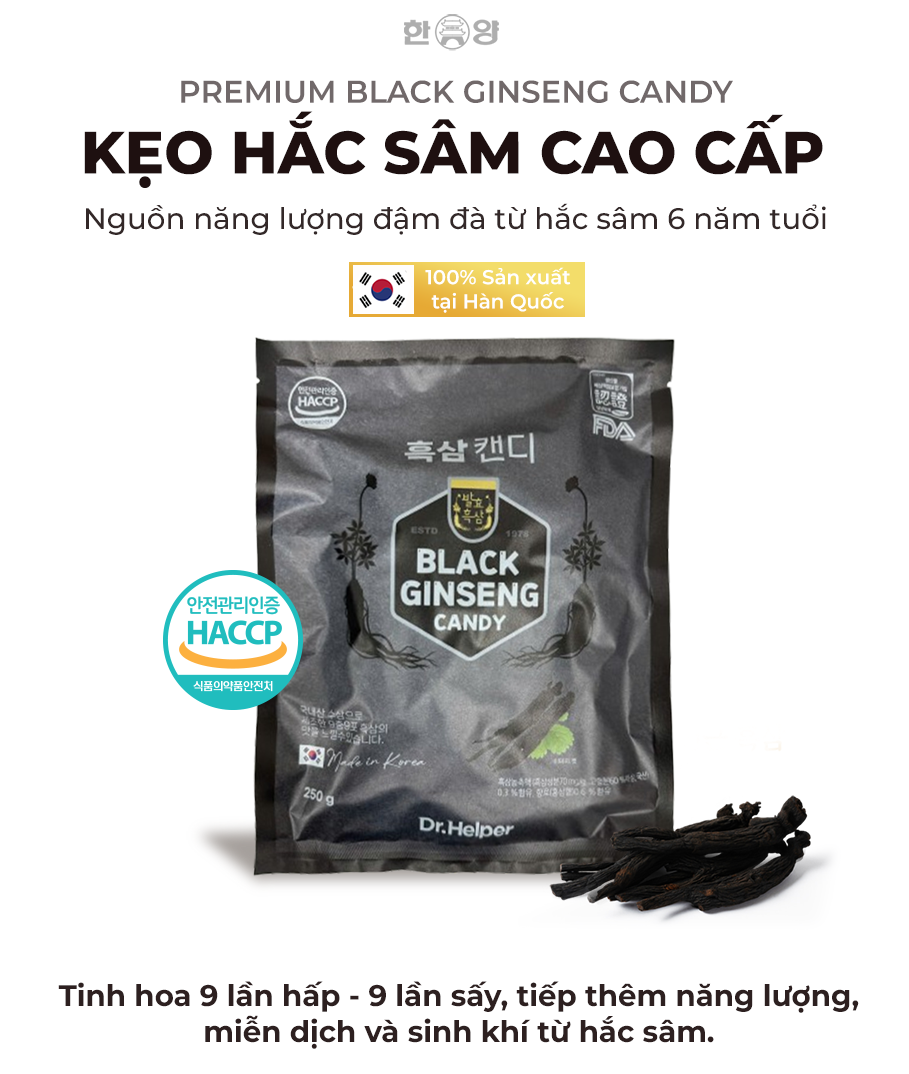 Kẹo hắc sâm Hàn Quốc là sản phẩm tiện lợi để thưởng thức hương vị sâm hảo hạng. Được chế biến theo phương pháp truyền thống 9 lần hấp, 9 lần sấy từ sâm tươi nội địa, mỗi viên kẹo mang vị ngọt thảo mộc đậm đà, kết hợp giữa chiết xuất hắc sâm và bột hồng sâm. Sản phẩm đạt chứng nhận an toàn HACCP và FDA, là lựa chọn chất lượng và đáng tin cậy cho sức khỏe.