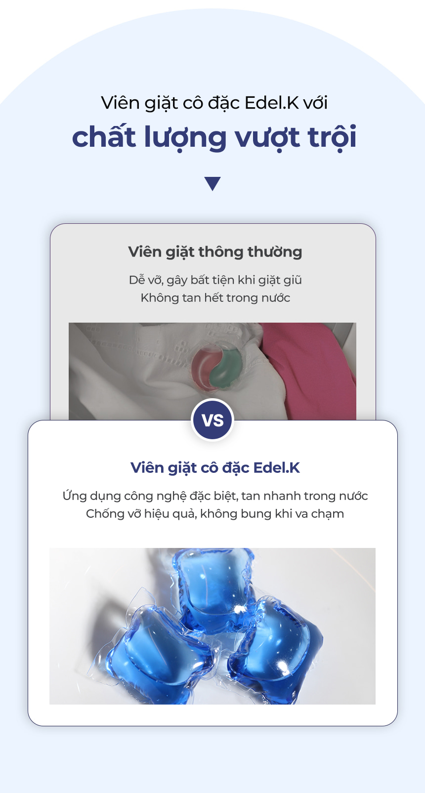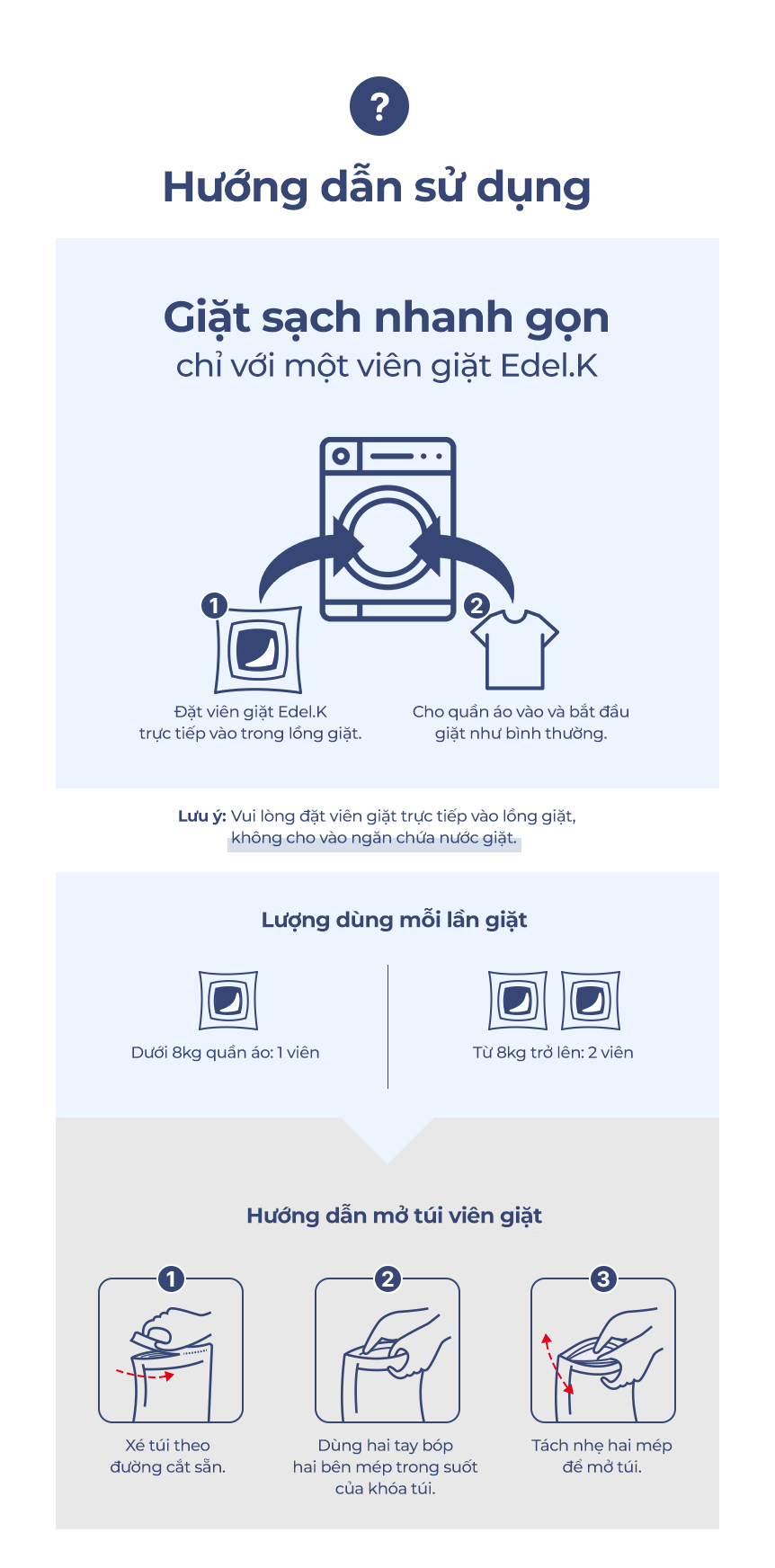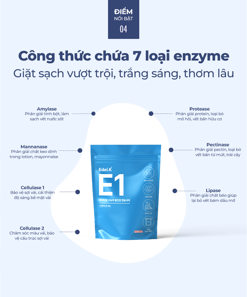 Viên giặt xả Edel.K E1 tan nhanh ngay cả trong nước lạnh, an toàn cho da, không chứa thành phần gây hại. Công thức 7 loại enzyme giúp đánh bay vết bẩn cứng đầu, giữ màu vải luôn sáng và bền đẹp.