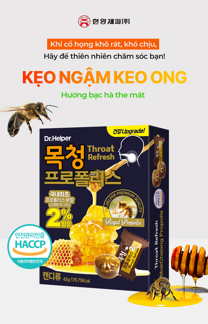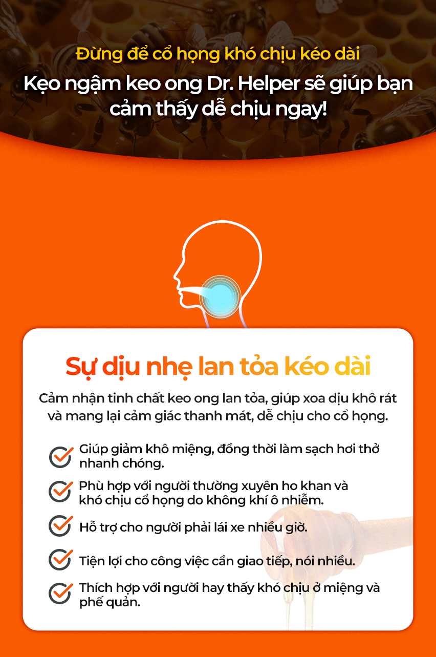 Kẹo ngậm keo ong và cát cánh Dr. Helper là giải pháp chăm sóc cổ họng tiện lợi hằng ngày. Sản phẩm kết hợp từ nhiều thành phần tự nhiên, giúp làm dịu cổ họng, mang lại cảm giác dễ chịu khi sử dụng. Đặc biệt phù hợp cho người thường xuyên nói nhiều, làm việc trong môi trường máy lạnh hoặc khi thời tiết thay đổi.