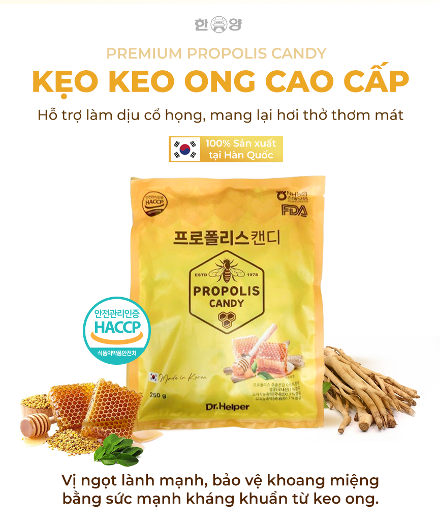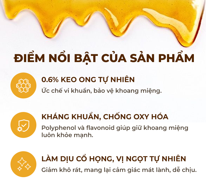 Sự kết hợp hoàn hảo giữa vị ngọt của mật ong và công dụng của keo ong. Giúp mang đến cảm giác dịu nhẹ cho cổ họng. Phù hợp để bạn chăm sóc họng hàng ngày.
