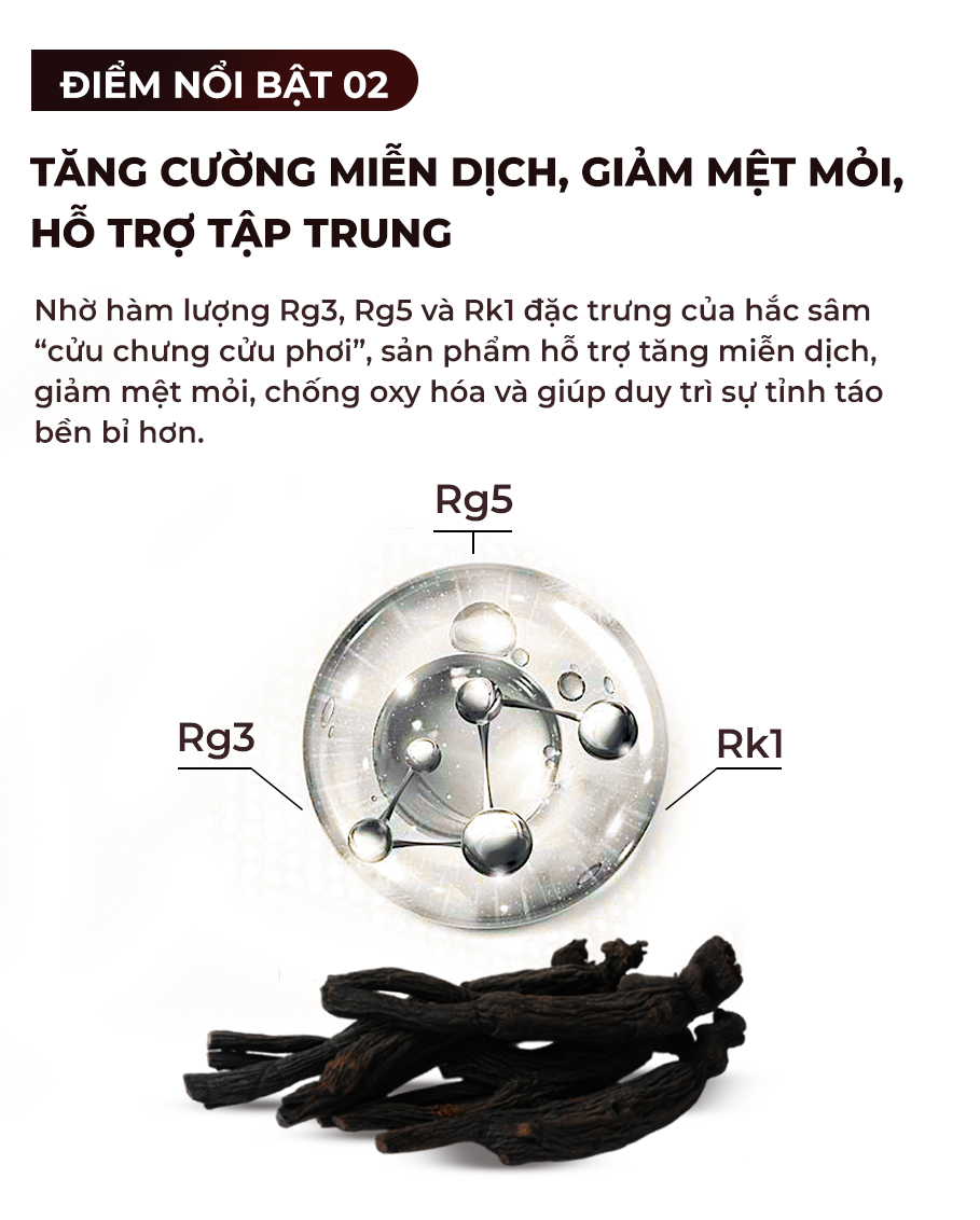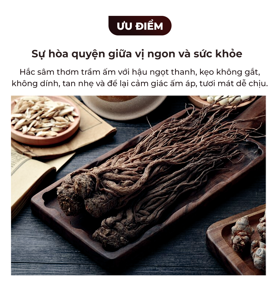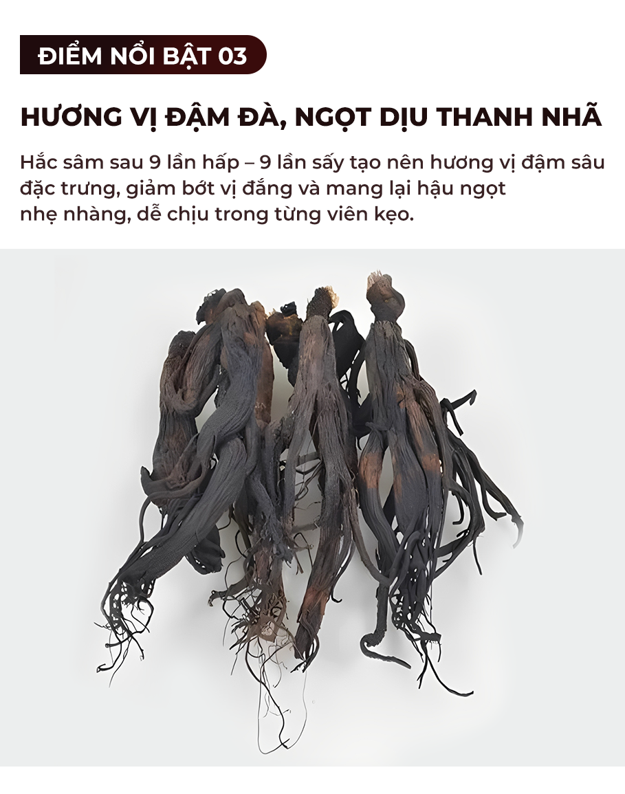 Kẹo hắc sâm Hàn Quốc là sản phẩm tiện lợi để thưởng thức hương vị sâm hảo hạng. Được chế biến theo phương pháp truyền thống 9 lần hấp, 9 lần sấy từ sâm tươi nội địa, mỗi viên kẹo mang vị ngọt thảo mộc đậm đà, kết hợp giữa chiết xuất hắc sâm và bột hồng sâm. Sản phẩm đạt chứng nhận an toàn HACCP và FDA, là lựa chọn chất lượng và đáng tin cậy cho sức khỏe.