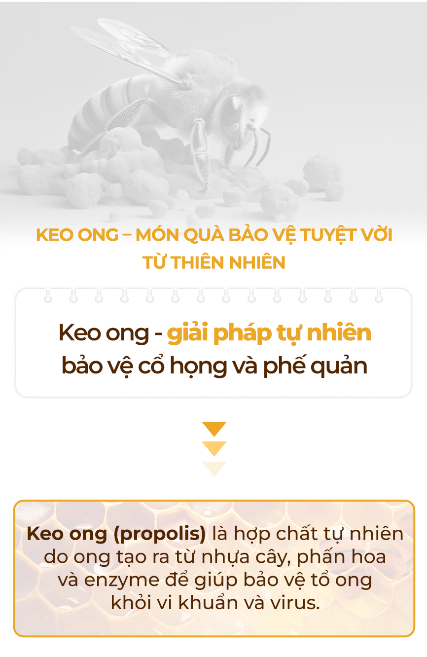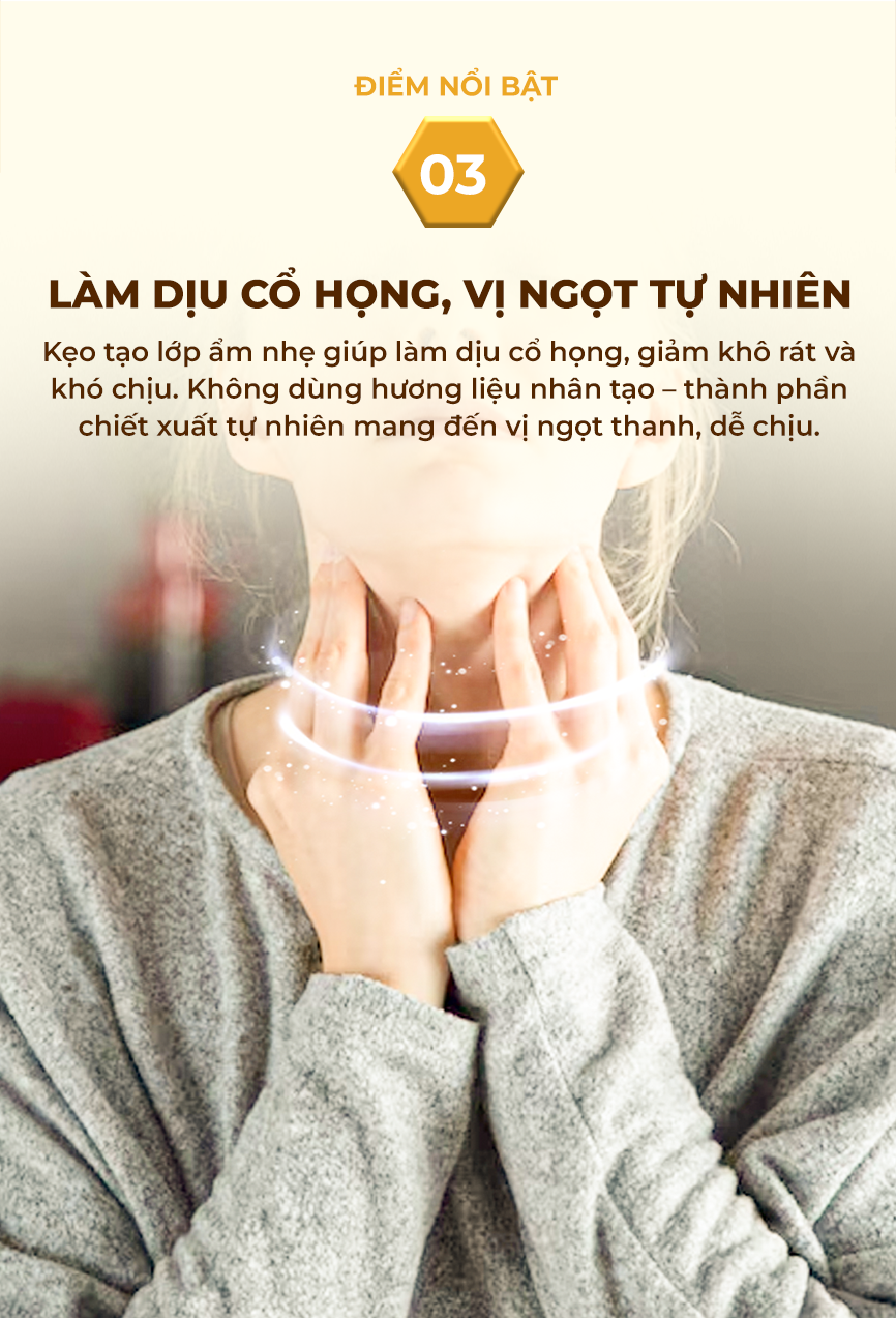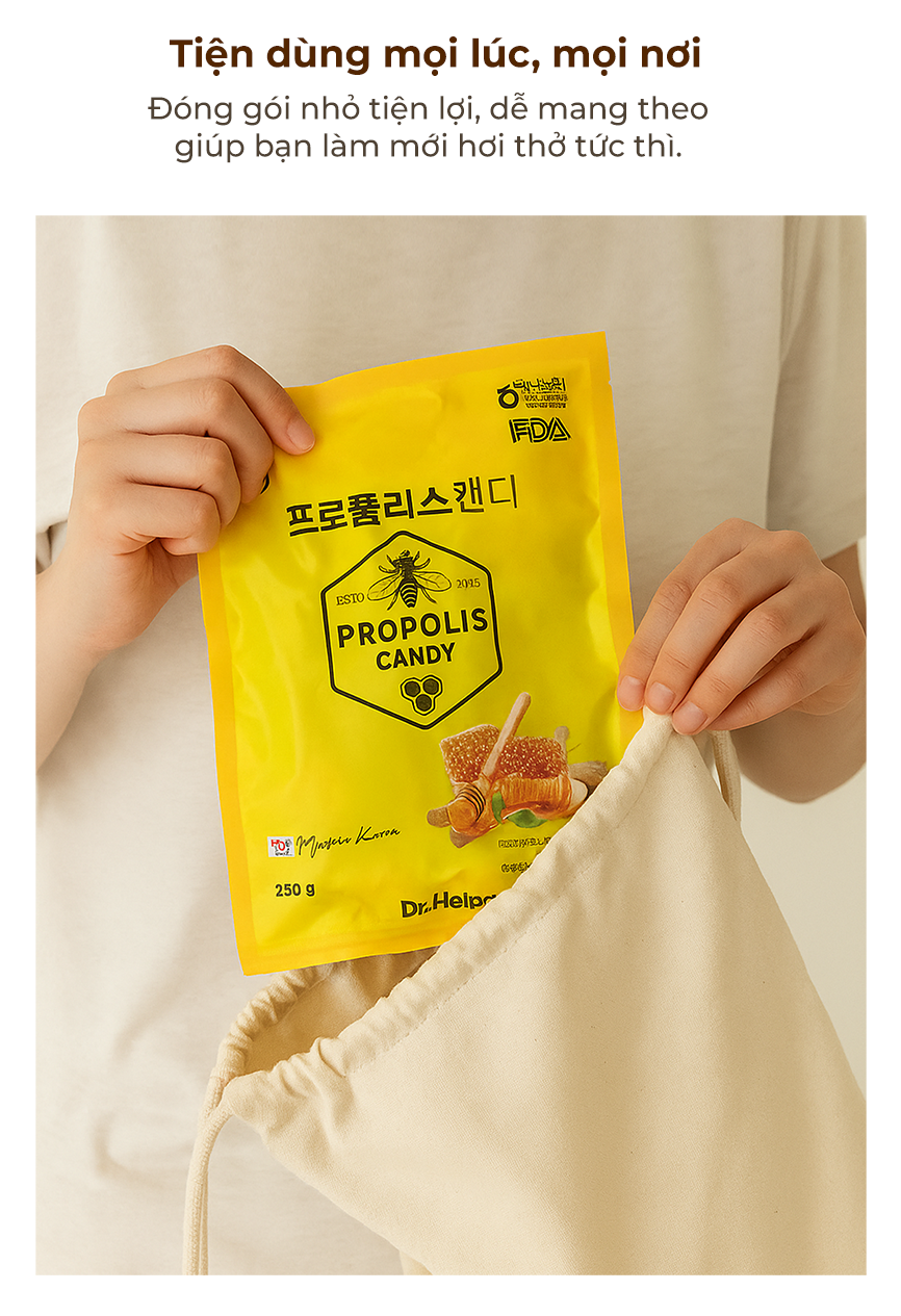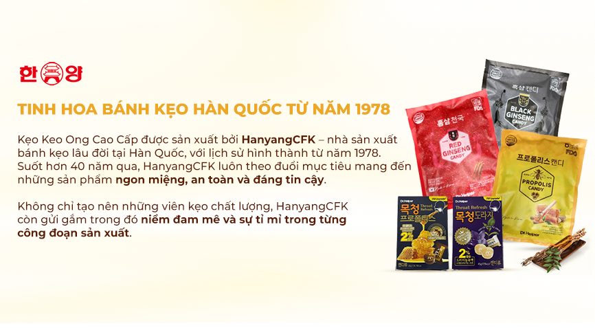 Kẹo keo ong Hàn Quốc là sự kết hợp hoàn hảo giữa vị ngọt của mật ong và công dụng của keo ong, cùng các chiết xuất thảo mộc truyền thống như cát cánh và mộc qua. Mỗi viên kẹo mang đến cảm giác dịu nhẹ cho cổ họng và hơi thở the mát sảng khoái. Sản phẩm được sản xuất tại Hàn Quốc với chứng nhận an toàn HACCP và FDA, là lựa chọn tiện lợi và đáng tin cậy để chăm sóc cổ họng hàng ngày.