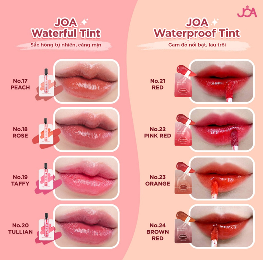 JOA Waterful Tint là dòng son tint bóng với kết cấu water tint mỏng nhẹ, cho đôi môi căng mọng, tươi tắn và tự nhiên suốt ngày dài.