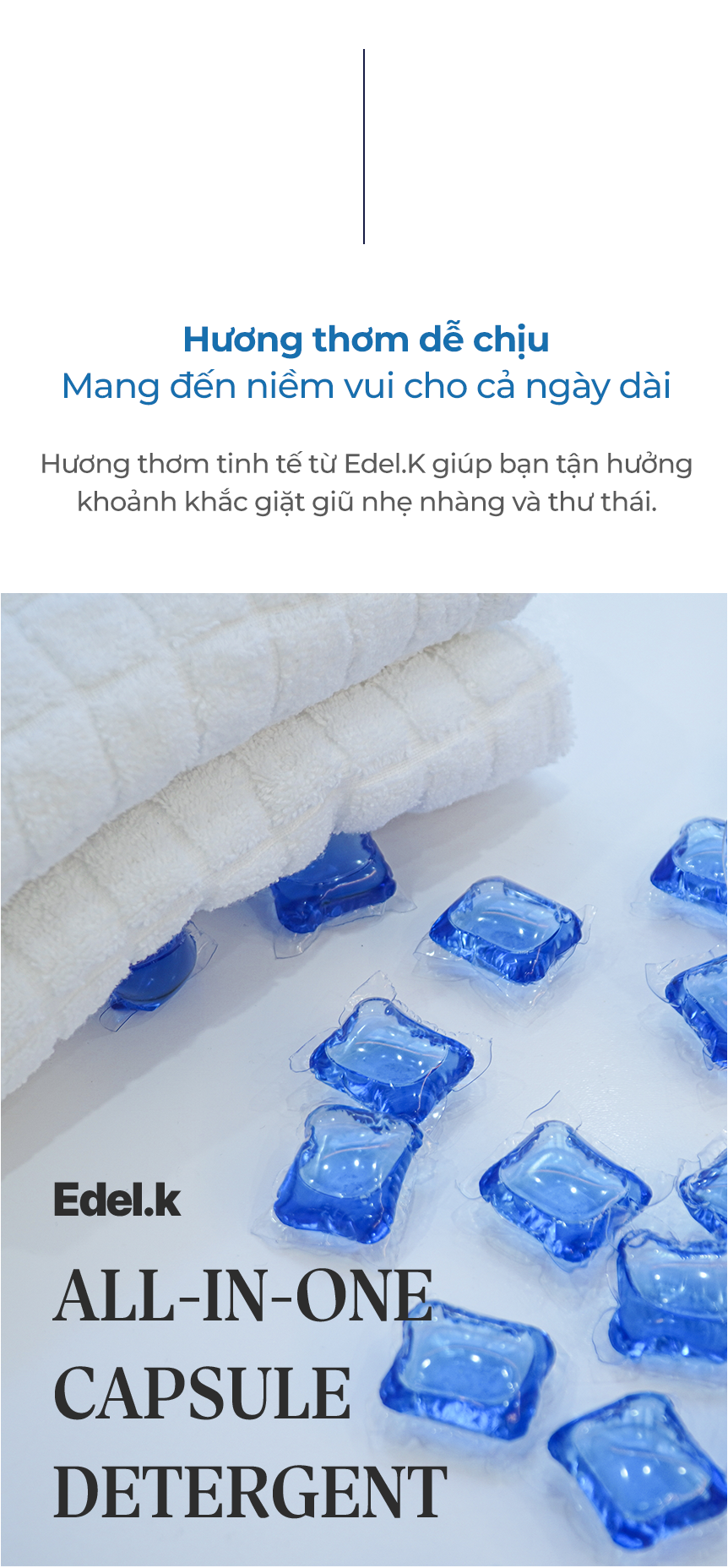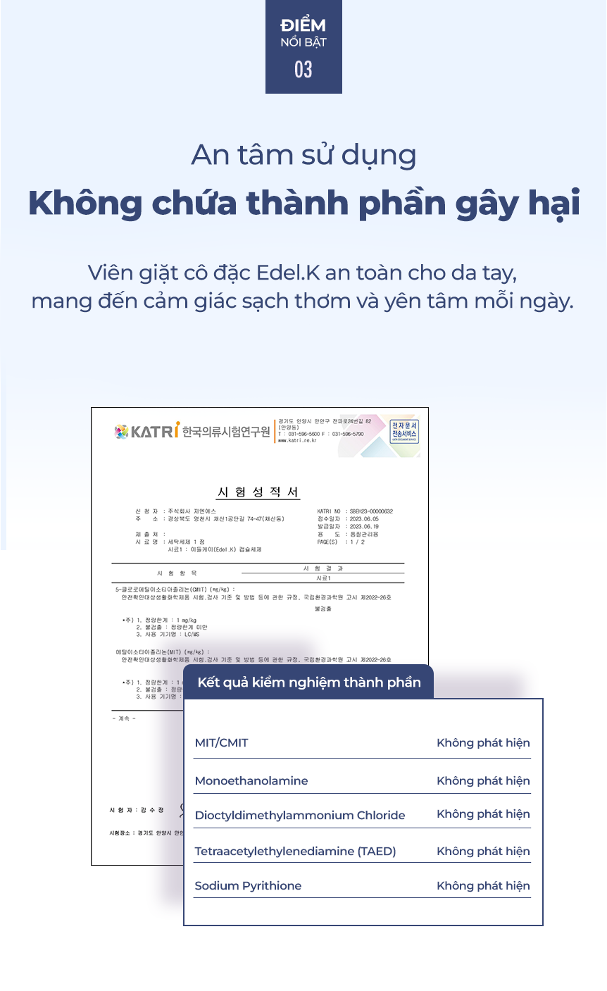 Viên giặt xả Edel.K E1 tan nhanh ngay cả trong nước lạnh, an toàn cho da, không chứa thành phần gây hại. Công thức 7 loại enzyme giúp đánh bay vết bẩn cứng đầu, giữ màu vải luôn sáng và bền đẹp.