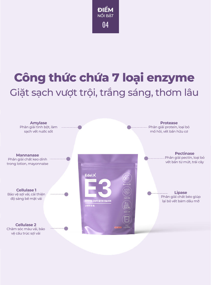 Viên giặt xả Edel.K E3 là giải pháp giặt giũ toàn diện, kết hợp sức mạnh của 7 loại enzyme giúp đánh bật mọi vết bẩn và bảo vệ sợi vải. Vỏ bọc tự tan hoàn hảo trong nước lạnh và công thức an toàn không chứa chất độc hại, mang lại sự tiện lợi và an tâm tối đa cho bạn.